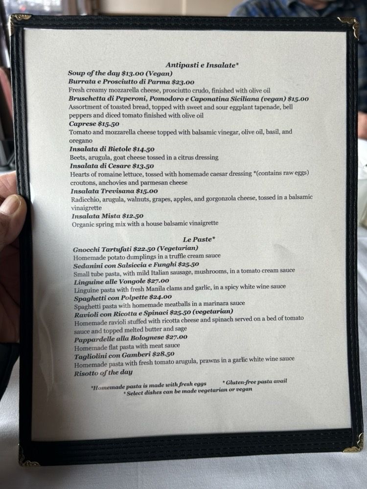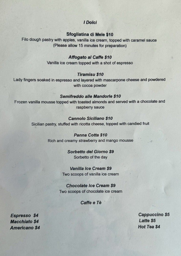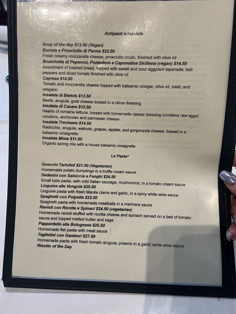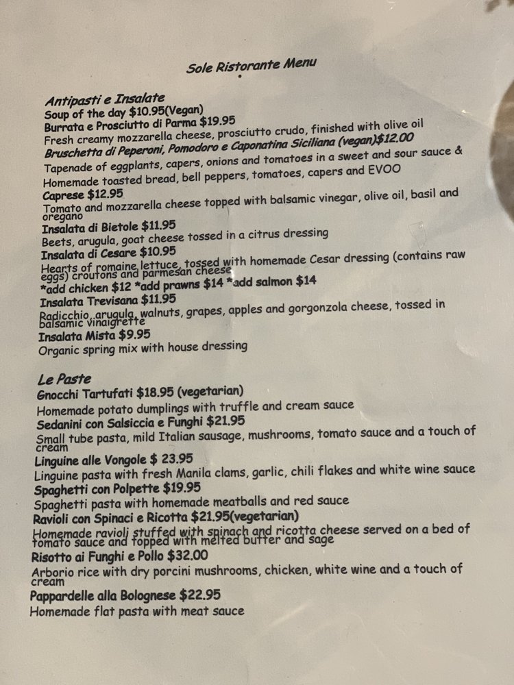 Introducing the menu at Sole Ristorante Italiano, a charming Italian beer bar located in San Mateo, CA. This restaurant offers a plethora of amenities including outdoor seating, vegan options, and happy hour specials. Customers rave about the excellent service and delicious food, with highlights such as the Truffle Gnocchi and Papperdelle Bolognese receiving top ratings. The cozy atmosphere allows for a casual dining experience, perfect for groups and families. The menu features a variety of classic Italian dishes like Burrata & Prosciutto and Braised Short Rib & Polenta, all served with attention to detail and flavor. Make sure to try their signature dishes and end the night with an Affogato for a perfect Italian dining experience at Sole Ristorante Italiano.